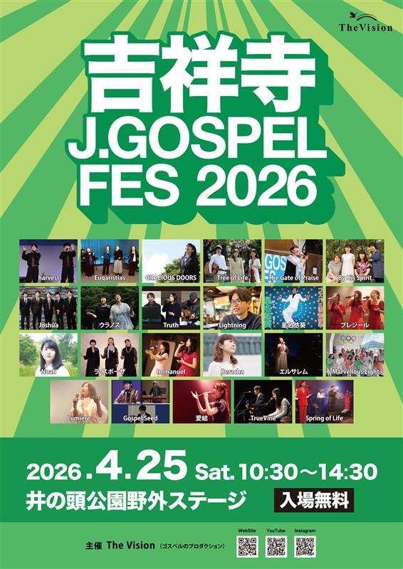 4月25日(土)井の頭公園野外ステージにて、吉祥寺J GOSPEL FES2026が行われます。 The VisionのYou Tubeチャンネルにて、配信も予定しております。 入場無料!ぜひお越しください♪